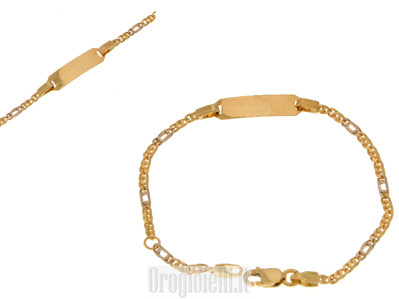 | Description Baby bracelet made entirely of 18 carat gold flat chain is made of white gold and yellow gold in the center a rectangular platelet (cm. 0.50 * 1.80) with the possibility of engraving.