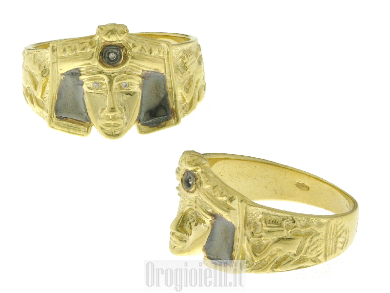 | Descripción Anillo hecho de oro de 18 quilates - 14 quilates - , la cabeza del faraón egipcio en forma, todo en la producción brillante, con partes en rodio negro y recogido 3 circonio cúbico.